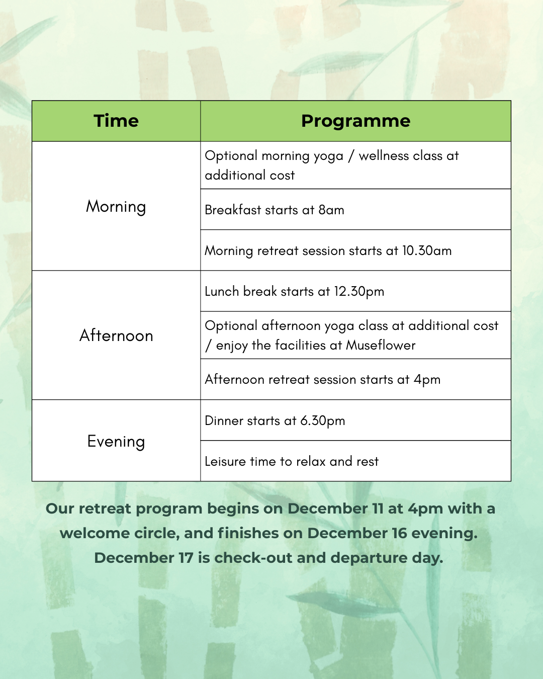 Should any of the facilitators have any emergencies and would need to postpone or cancel the retreat program, and replacements cannot be found, all deposits paid to Museflower Retreat & Spa will be refunded 100%.