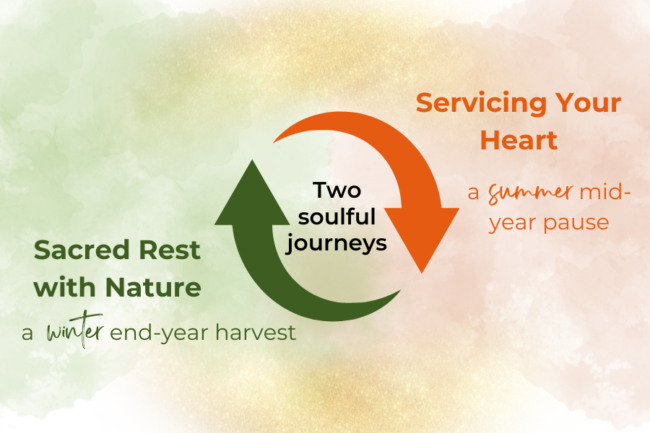 This winter soulful retreat “Sacred Rest with Nature” invites you into deeper rest as you wrap up the year, while the summer soulful retreat “Servicing Your Heart” offers a mid-year pause to recenter and recalibrate your energy,
